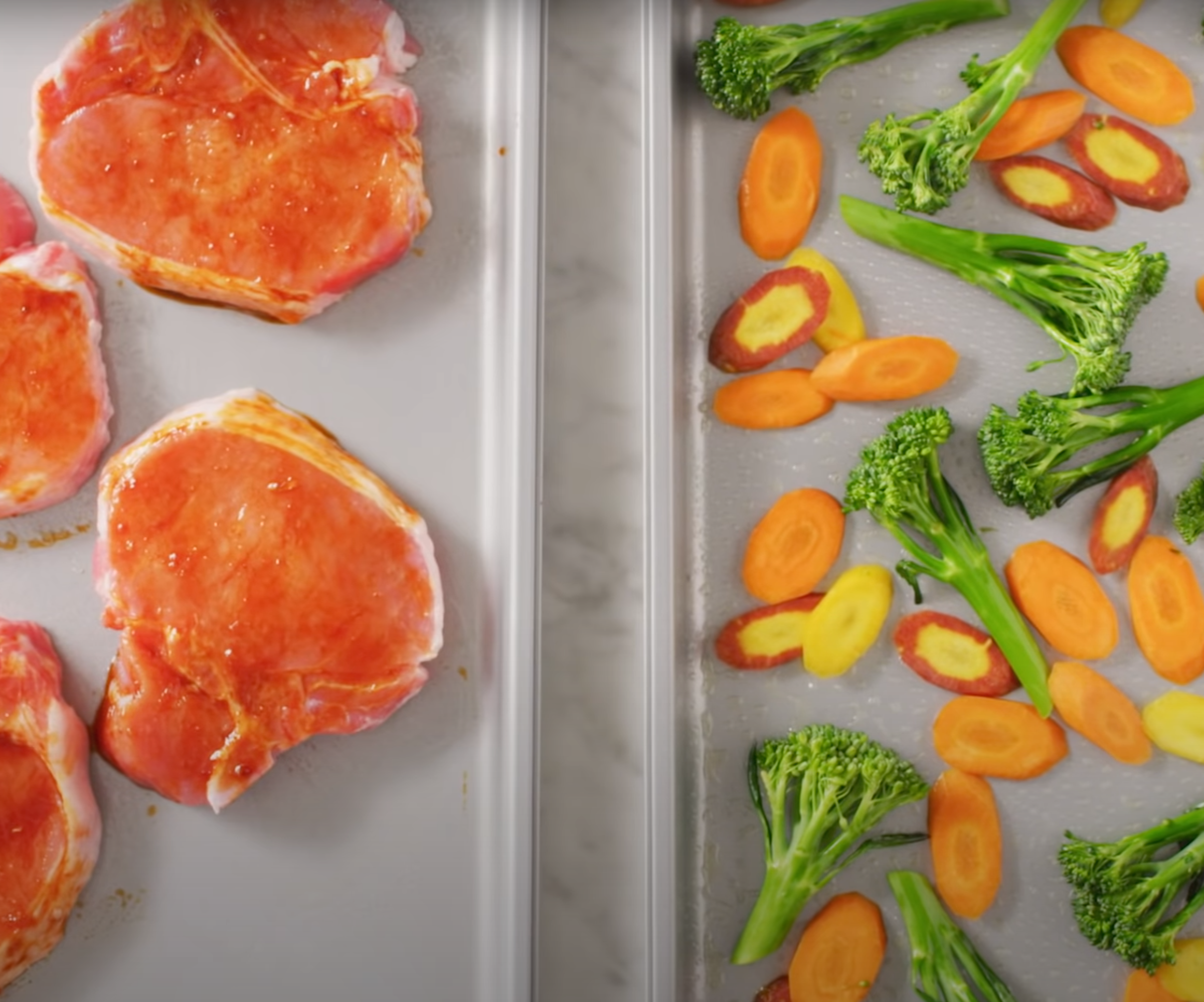 - Lightly spray 2 large rimmed baking pans with cooking spray. Place chops on one of the prepared pans. Brush pork chops with remaining glaze mixture.